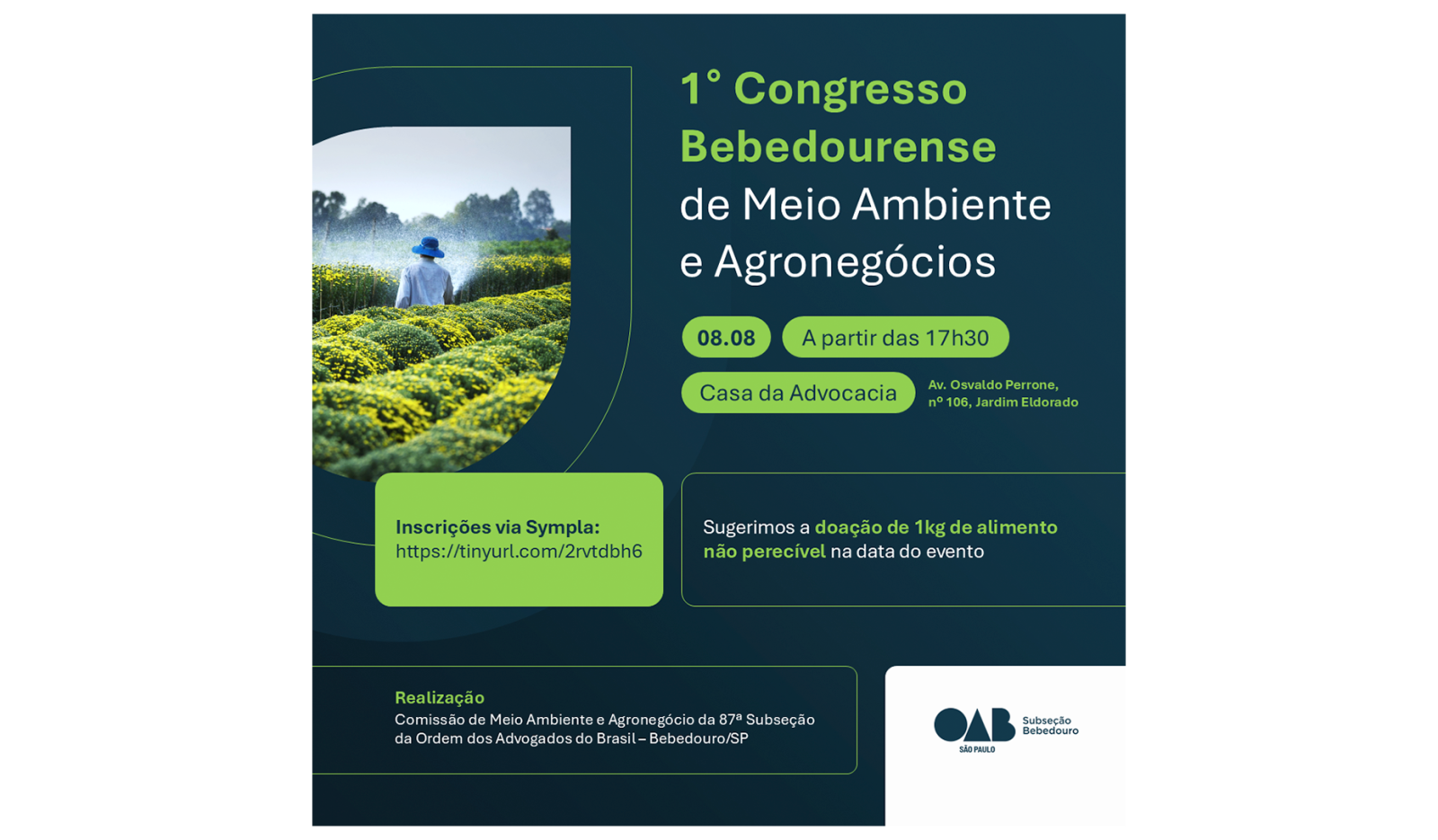 A Comissão de Meio Ambiente e Agronegócio da 87ª Subseção da OAB/Bebedouro (Ordem dos Advogados do Brasil) promove na quinta-feira (8), a partir das 17h30, o 1º Congresso Bebedourense de Meio Ambiente e Agronegócio.