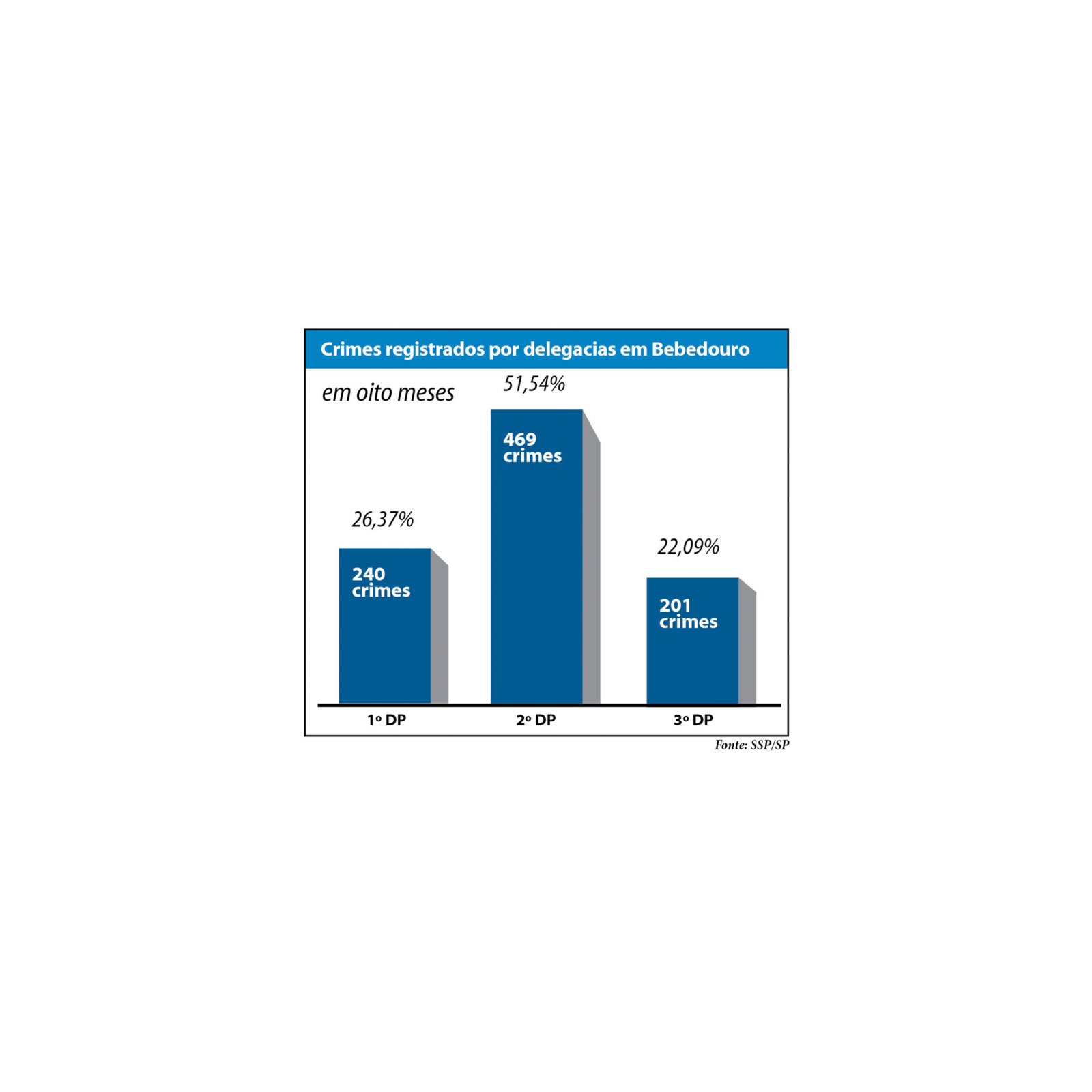 Dados das estatísticas criminais entre janeiro e agosto deste ano, disponibilizados pela SSP/SP (Secretaria de Segurança Pública do estado de São Paulo), mostram que entre os distritos policiais de Bebedouro, o 2º DP, localizado no Jd. Cláudia II, na zona Norte, é o que mais recebe registros de ocorrências de crimes, totalizando 469 deles, nos oito meses de 2022, representando 51,54% de todos os crimes da cidade. No total, Bebedouro já contabiliza 910 crimes registrados nos três distritos policiais da cidade.