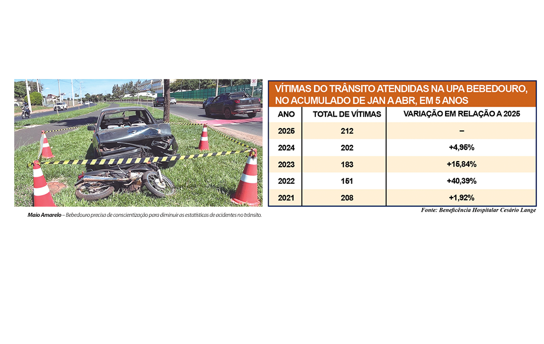 O número de vítimas de acidentes de trânsito atendido pela UPA24h de Bebedouro, em abril, chegou a 69, crescimento de 102,94% em relação às 32 vítimas socorridas e encaminhadas à emergência durante o mês de março. Além disto, os dados do quarto mês de 2025 é o maior deste ano, superando os 52 acidentados de janeiro e os 57 de fevereiro. O número voltou a crescer após março ter registrado mais de 40% de queda em relação a fevereiro e ser o menor índice do ano até então.