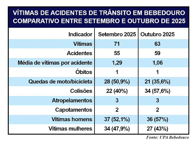 O relatório mensal da UPA (Unidade de Pronto Atendimento) referente a outubro de 2025 mostra que 63 pessoas foram atendidas em decorrência de 59 acidentes de trânsito registrados no município ao longo do mês. Os dados apontam para cenário misto: queda no número de vítimas, mas aumento no total de ocorrências em comparação com setembro.