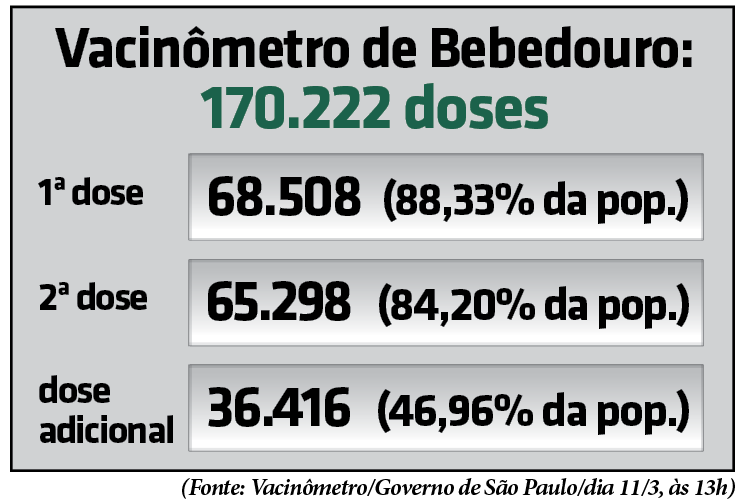 Vacinômetro atualizado pelo governo de São Paulo, às 13h, de sexta-feira (11), informa 68.508 bebedourenses com 1ª dose (88,33% da população). 65.298 pessoas receberam 2ª dose ou dose única (84,20% da população) e 36.416 bebedourenses estão com a dose de reforço (46,96%).