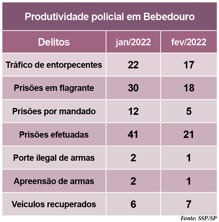 Em fevereiro, Bebedouro registrou 69 inquéritos instaurados, dentre 13 itens abordados nas seis delegacias de polícia da cidade, contabilizando nove registros a mais que no mês anterior. Os dados são da SSP/SP (Secretaria de Segurança Pública do Estado de São Paulo), referentes ao segundo mês deste ano.