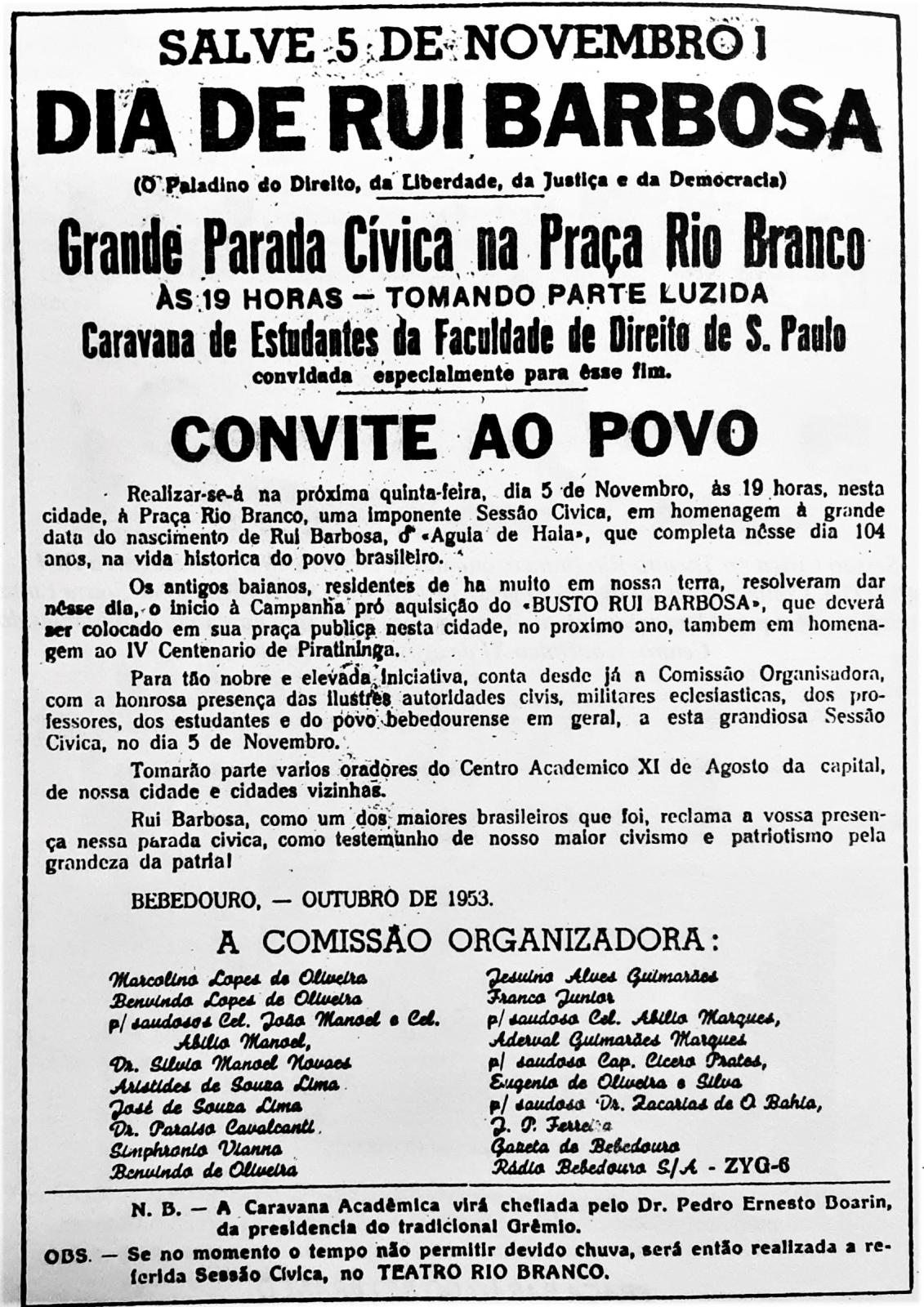 Maior atenção foi destinada à data de 5 de novembro de 1953, aniversário de 104 anos de seu nascimento, e que foi declarada como o “Dia de Rui Barbosa” tendo sido programada uma “Grande Parada Cívica”, com a participação de uma caravana de estudantes da Faculdade de Direito de São Paulo, incluindo oradores do Centro Acadêmico XI de Agosto, daquela instituição.