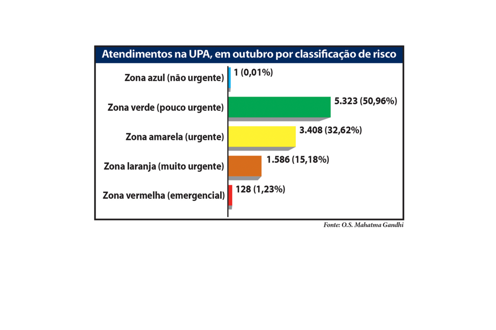 Em outubro, a UPA de Bebedouro atendeu 10.446 pessoas, aumento de 4,64% em relação aos 9.982 atendimentos registrados em setembro. Do total de pacientes que deram entrada na Unidade no décimo mês de ano, 5.323 foram classificados na zona verde, como casos pouco urgentes, representando 50,96%. O relatório foi divulgado a pedido da Gazeta pela O.S Mahatma Gandhi, organização responsável pela unidade.