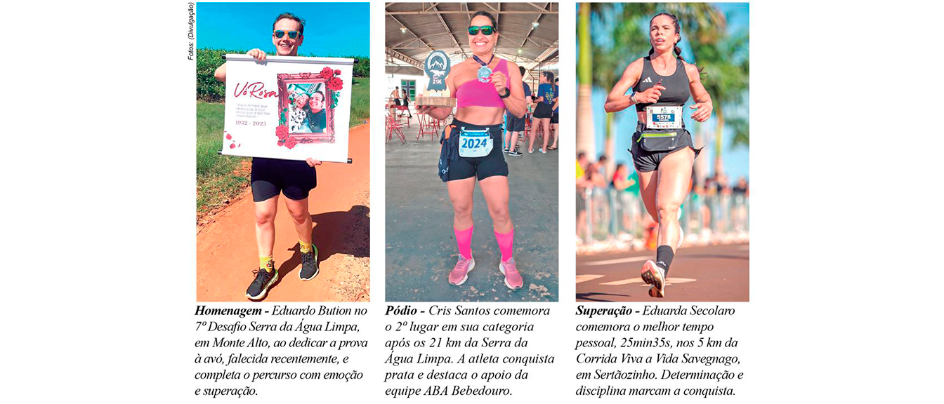 O domingo (9) foi de superação e emoção para os corredores de Bebedouro, que representaram a cidade em duas competições na região: o 7º Desafio Serra da Água Limpa, em Monte Alto, e a 12ª Corrida Viva a Vida Savegnago, em Sertãozinho. Entre subidas íngremes, percursos desafiadores e histórias inspiradoras, os atletas bebedourenses mostraram garra, preparo e sentimento, com direito a pódio e homenagens especiais.