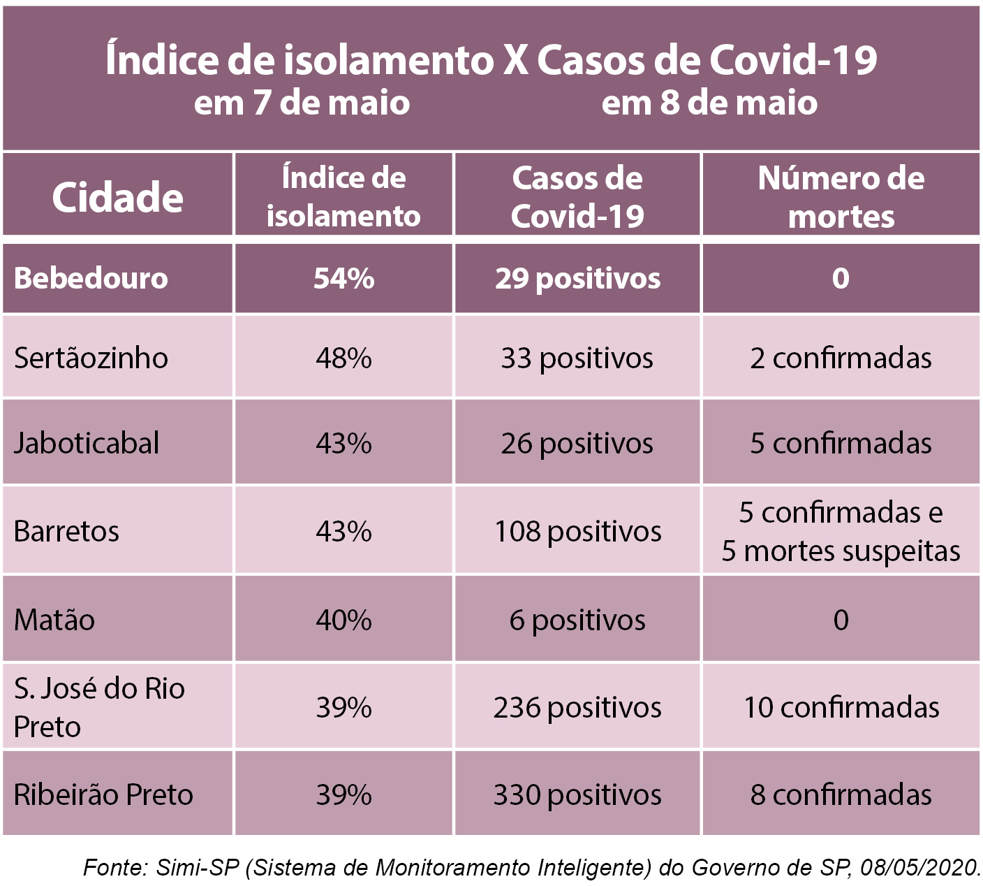 Na segunda (4), Bebedouro apresentava índice de 55%. Na terça (5), caiu para 53% e manteve o índice na quarta (6), em 14º lugar no ranking paulista. Já na quinta-feira (7), voltou a subir, ficando em 12º lugar na tabela da Estado, com 54% de isolamento.