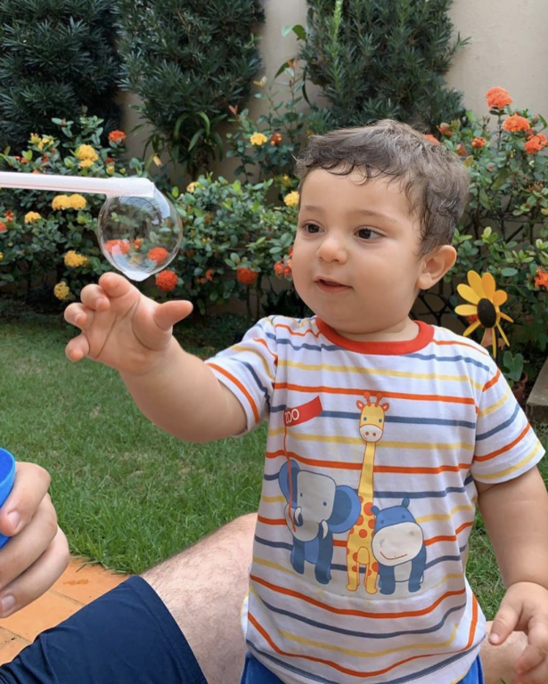 Com toda alegria, Antonio brinca com a bolha de sabão e sorri com os olhos.