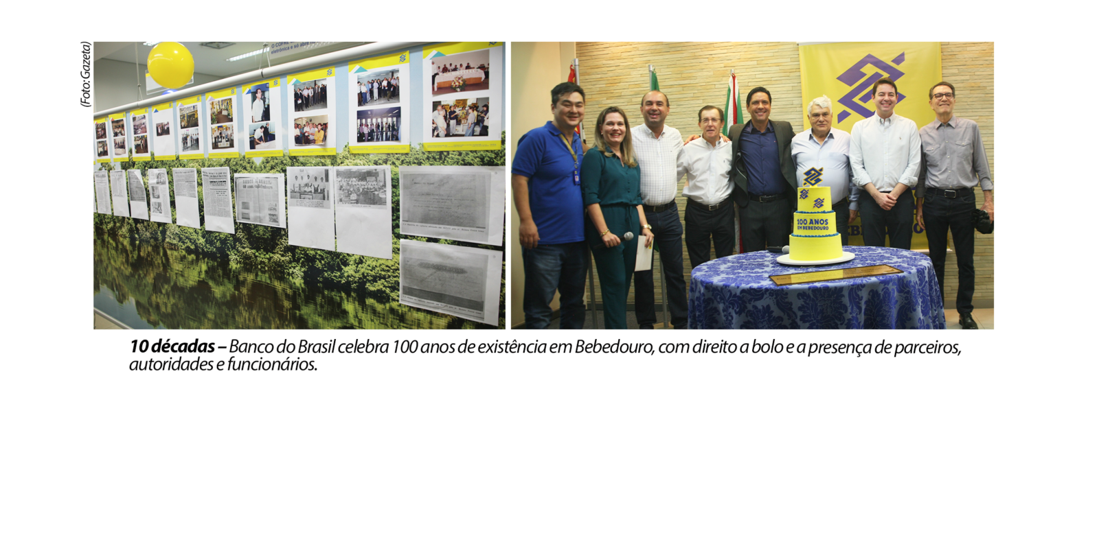 A agência 0054 do Banco do Brasil completou 100 anos de operações em Bebedouro e, por estar em reforma, a agência da rua Conrado Caldeira é que recebeu convidados na manhã de sexta-feira (10), recepcionados pelo gerente geral Rogério Garcia. A solenidade contou com a participação de representantes de entidades de classe, clientes, servidores, ex-funcionários como João Luiz Armelin e José Vicente da Silva, dentre muitos; lideranças políticas, dentre eles, o prefeito Lucas Seren, o ex-prefeito Fernando Galvão e o vereador Paulo Bianchini.