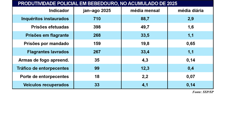 A SSP/SP (Secretaria de Segurança Pública do Estado de São Paulo) divulgou os números da produtividade policial de Bebedouro referente aos oito primeiros meses de 2025. O levantamento mostra oscilações nos principais indicadores, com destaque para prisões em flagrante e elevado número de inquéritos instaurados.