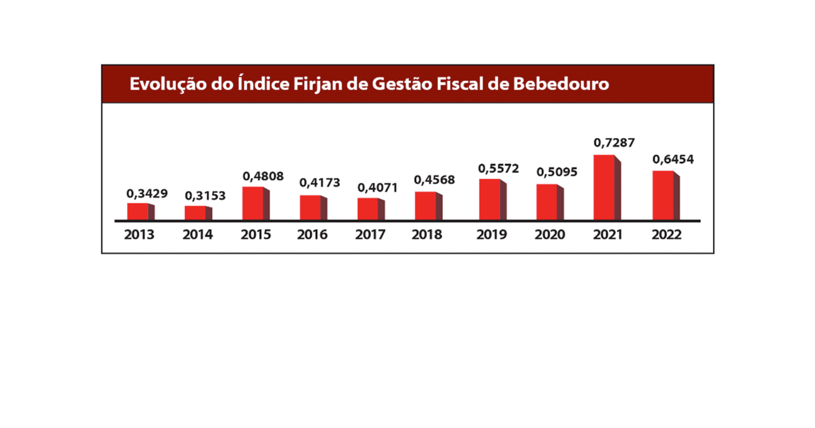 Em 2022, Bebedouro registrou boa gestão fiscal, com nota de 0,6454. É o que aponta o Índice Firjan de Gestão Fiscal, elaborado pela Federação das Indústrias do Estado do Rio de Janeiro. O levantamento feito anualmente foi divulgado em 31 de outubro e traz análise das contas públicas de 5.240 cidades brasileiras.