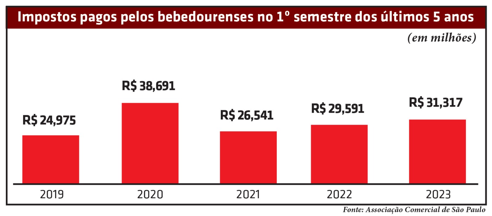 Os bebedourenses desembolsaram R$ 31,317 milhões em impostos, no período de janeiro a junho deste ano. O valor representa aumento de 5,83% em relação aos seis meses de 2022 (R$ 29,591 milhões), segundo dados do Impostômetro da Associação Comercial de São Paulo (ACSP), sistema que estima o quanto de tributos foram pagos pelos paulistas aos governos federal, estadual e às cidades.