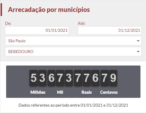 De janeiro a novembro deste ano, os bebedourenses já desembolsaram R$ 54,185 milhões em impostos, segundo o “Impostômetro” da Associação Comercial de São Paulo (ACSP), sistema que estima o quanto de tributos foram pagos pelos paulistas aos governos federal, estadual e às cidades. O valor representa aumento de 11,48% em relação ao valor arrecadado no mesmo período do ano passado (R$ 48,603 milhões).