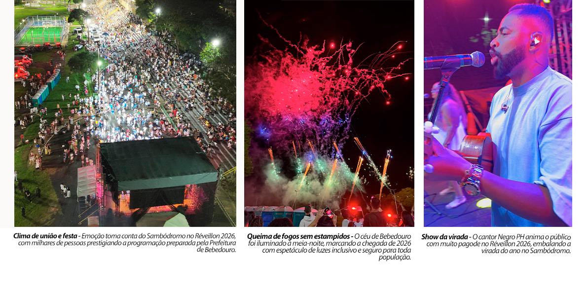 A Prefeitura de Bebedouro celebrou a chegada de 2026 com grande festa de Réveillon realizada na noite de 31 de dezembro, no Sambódromo Municipal, reunindo famílias, amigos e visitantes em clima de alegria, união e confraternização, com programação musical diversificada e queima de fogos sem estampidos, respeitando as leis municipais e trazendo de volta este tradicional espetáculo de luzes no céu na hora da virada, após anos de ausência.