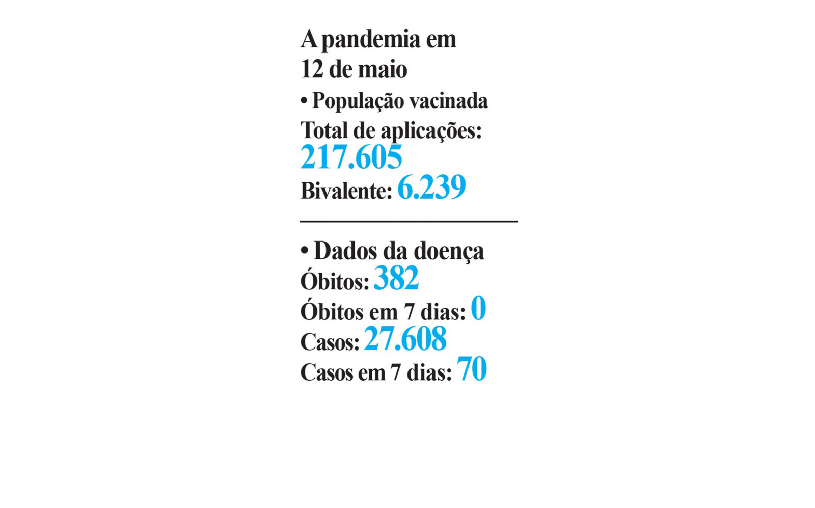 Vacinação – O vacinômetro do governo de SP mostra a aplicação de 217.605 doses em Bebedouro. A vacina bivalente, disponível para todos acima de 18 anos, foi aplicada em 6.239 pessoas, ou seja, em uma semana, a Vigilância aplicou 694 doses desta vacina.