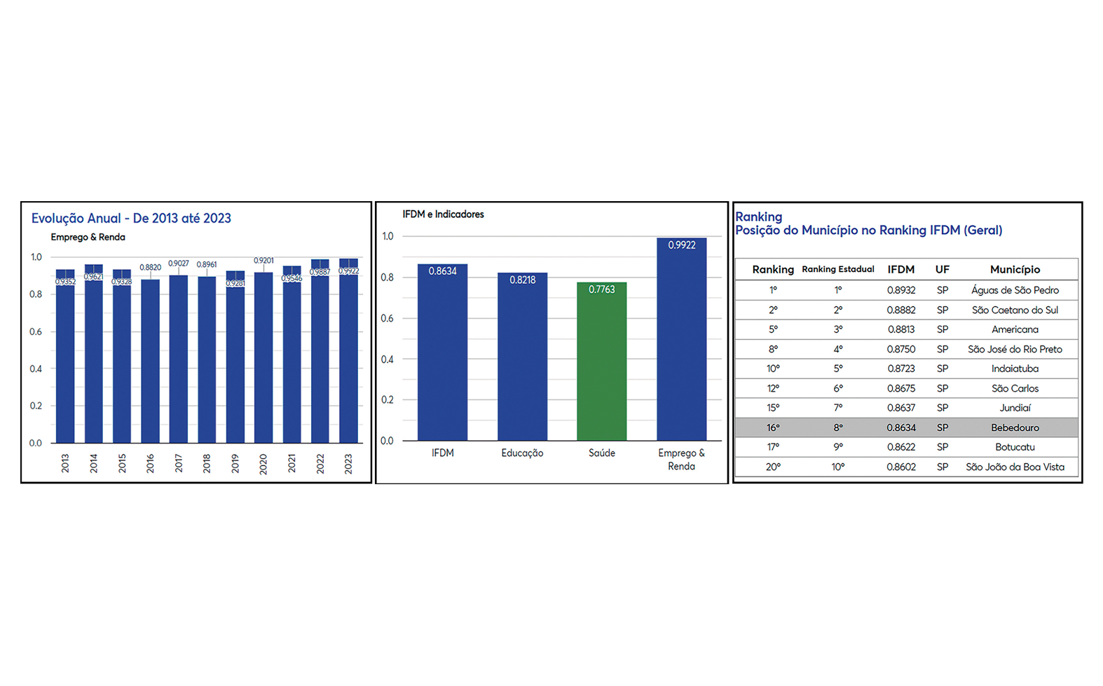 Divulgado no início de maio de 2025, o IFDM (Índice Firjan de Desenvolvimento Municipal) apresenta dados referentes ao ano-base de 2023 e avalia os municípios brasileiros em três áreas fundamentais: Emprego e Renda, Educação e Saúde. As notas variam de 0 a 1 e são divididas em quatro categorias: Desenvolvimento Crítico (abaixo de 0,4), Desenvolvimento Baixo (entre 0,4 e 0,6), Desenvolvimento Moderado (entre 0,6 e 0,8) e Desenvolvimento Alto (acima de 0,8).