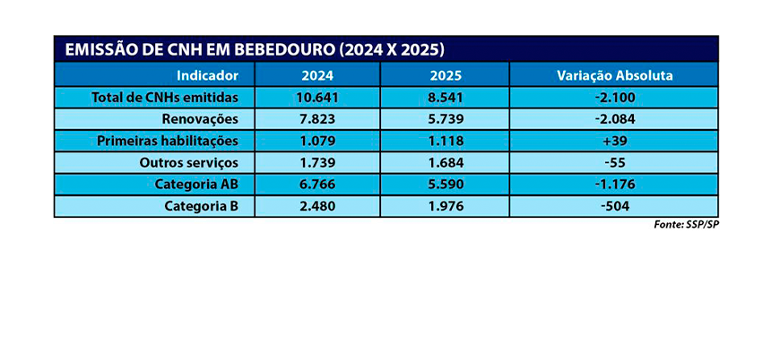 Os dados do Detran-SP indicam que Bebedouro registrou, ao longo de 2025, a emissão de 8.541 CNHs (Carteiras Nacionais de Habilitação). O volume engloba renovações, primeiras habilitações e outros serviços relacionados ao documento, como adição ou mudança de categoria.
