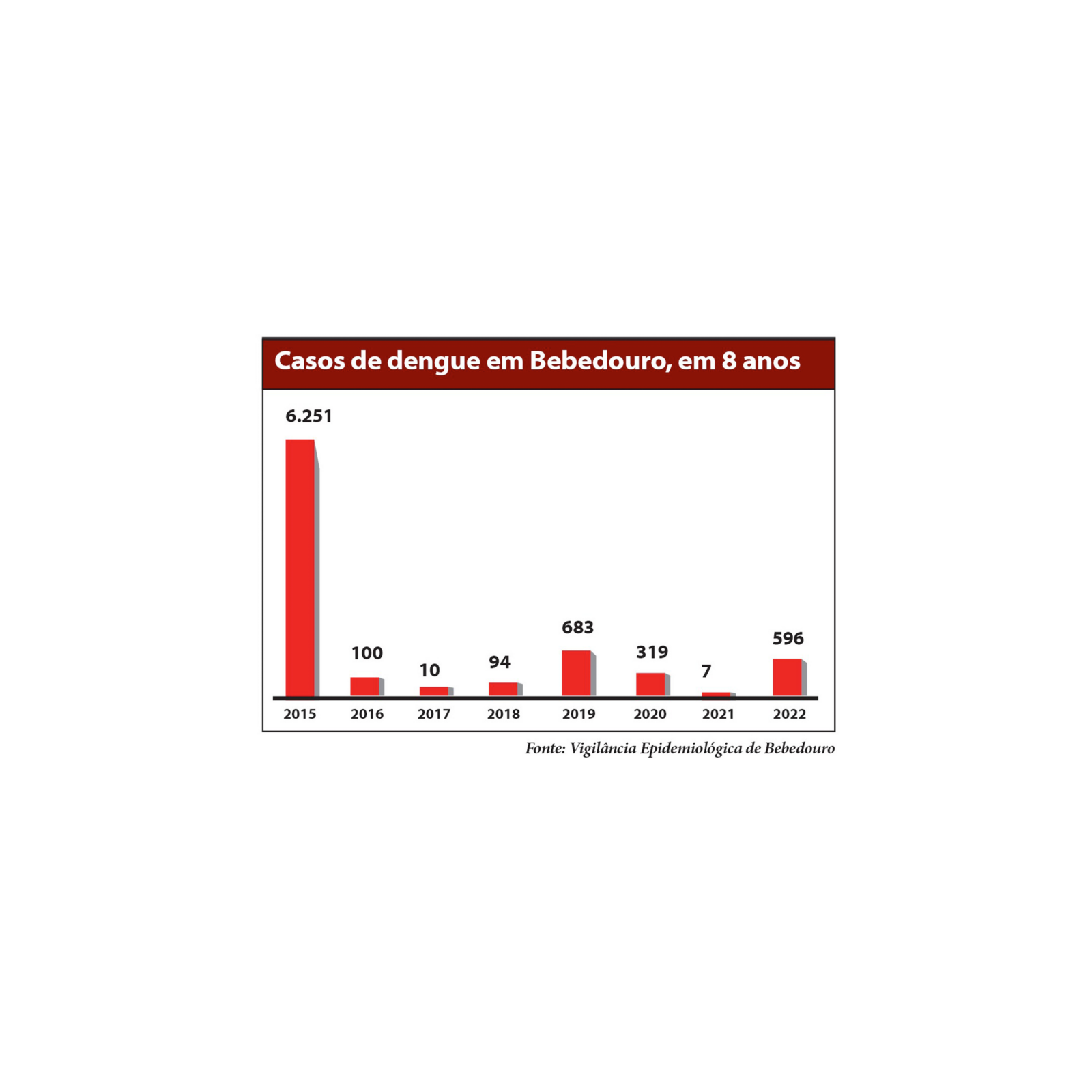 Bebedouro encerrou 2022 com 596 casos positivados de dengue. Deste total, 524 entre moradores da cidade e outros 68 pacientes confirmados que são moradores de outras cidades da região. Deste total, foram dois óbitos.