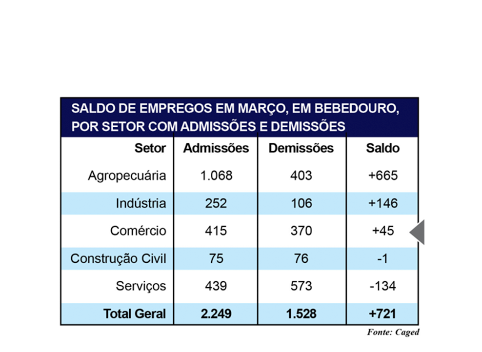 Em março, o saldo de empregos de Bebedouro fechou positivo, com criação de 721 vagas formais. Este dado é resultado de 2.249 contratações e 1.528 demissões e variação relativa de 2,57%.