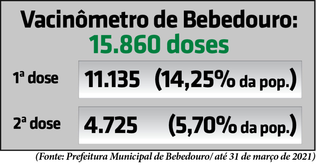 De acordo com dados da Secretaria Municipal de Saúde, até o momento, Bebedouro aplicou 15.860 doses, sendo que 11.135 pessoas receberam a primeira dose (14,25% da população) e 4.725 pessoas já foram imunizadas com as duas doses (5,70%), quase o dobro da média das cidades brasileiras, que imunizaram apenas 8,32% e 2,4% da população, respectivamente.