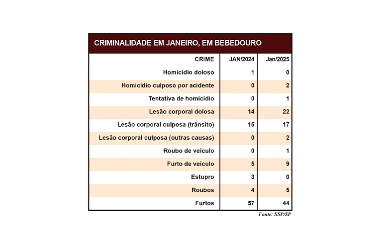 A Secretaria de Segurança Pública do Estado de São Paulo divulgou os dados das estatísticas criminais referentes ao mês de janeiro de 2025, em Bebedouro. A análise comparativa em relação ao mesmo período de 2024 revela mudanças significativas em diferentes tipos de ocorrências.