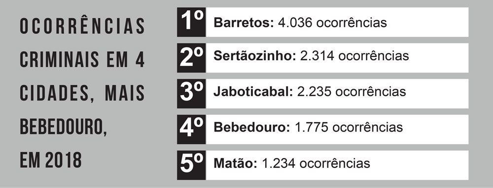 A Gazeta preparou comparativo das estatísticas criminais, após divulgação pela Secretaria da Segurança Pública do Estado, dos dados referentes a Bebedouro e outras quatro cidades da região: Jaboticabal, Matão, Sertãozinho e Barretos.