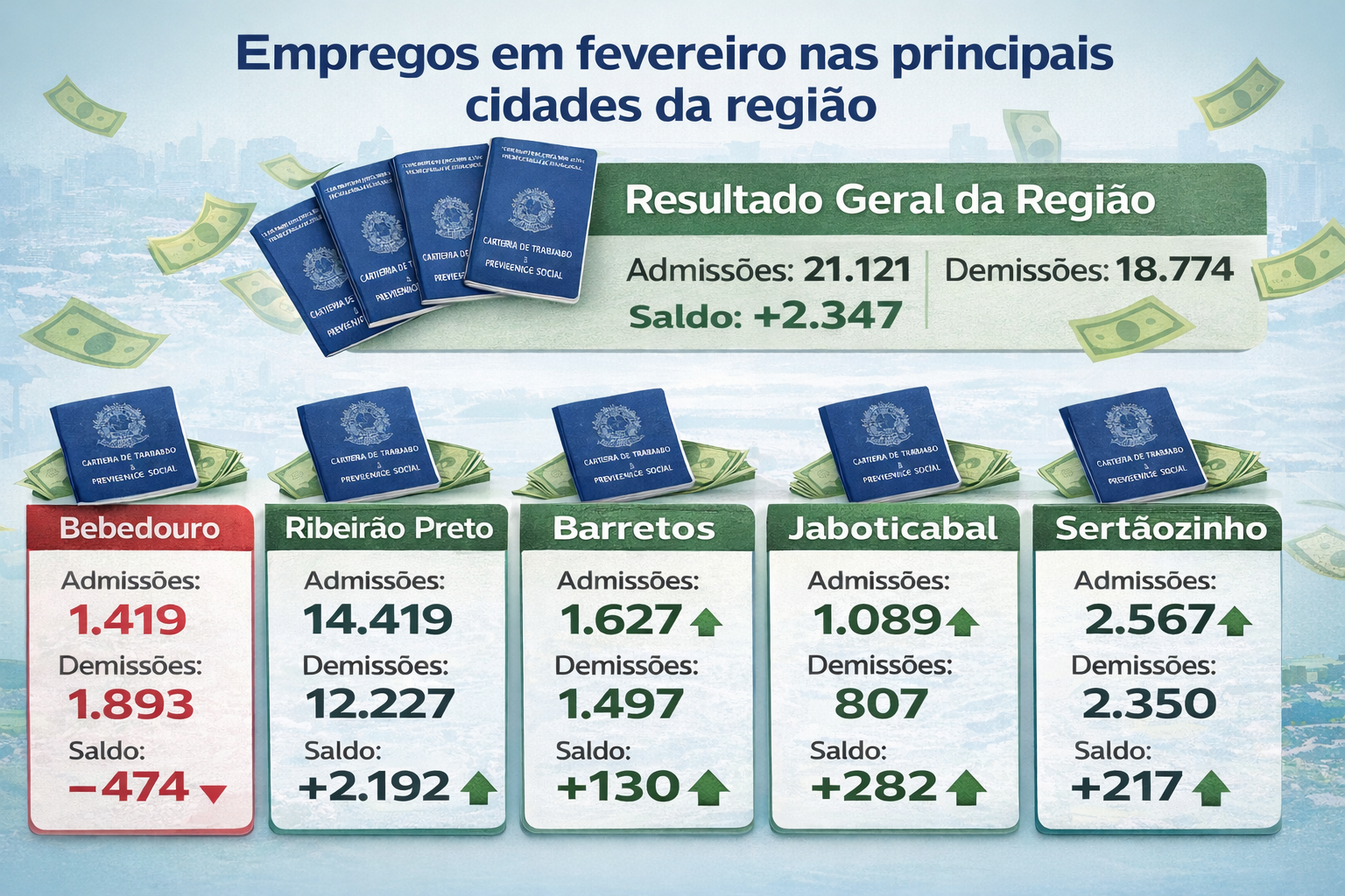 Bebedouro foi a única cidade dentre as pesquisadas da região analisada pela Gazeta a registrar saldo negativo na geração de empregos formais em fevereiro, segundo dados do Caged. O município fechou o mês com (-) 474 vagas, principalmente pelo baixo desempenho da agropecuária. Na contramão, cidades vizinhas apresentaram crescimento, com destaque para Ribeirão Preto, que liderou a geração de empregos e reforçou seu papel como principal polo econômico regional.