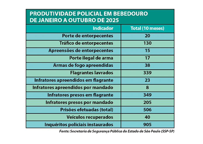 Ao longo dos 10 primeiros meses de 2025, as forças de segurança de Bebedouro registraram movimentação constante em ações ligadas ao combate ao tráfico de drogas, porte ilegal de armas, prisões e recuperação de bens. Os dados são da SSP-SP (Secretaria de Segurança Pública do Estado de São Paulo) e mostram a curva mensal das operações policiais.
