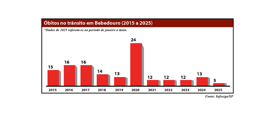 Dados do Infosiga-SP (Sistema de Informações Gerenciais de Acidentes de Trânsito do Estado de São Paulo) mostram que, de janeiro a maio de 2025, cinco pessoas perderam a vida em acidentes de trânsito em Bebedouro, tanto em vias urbanas quanto nas rodovias que cortam o município.