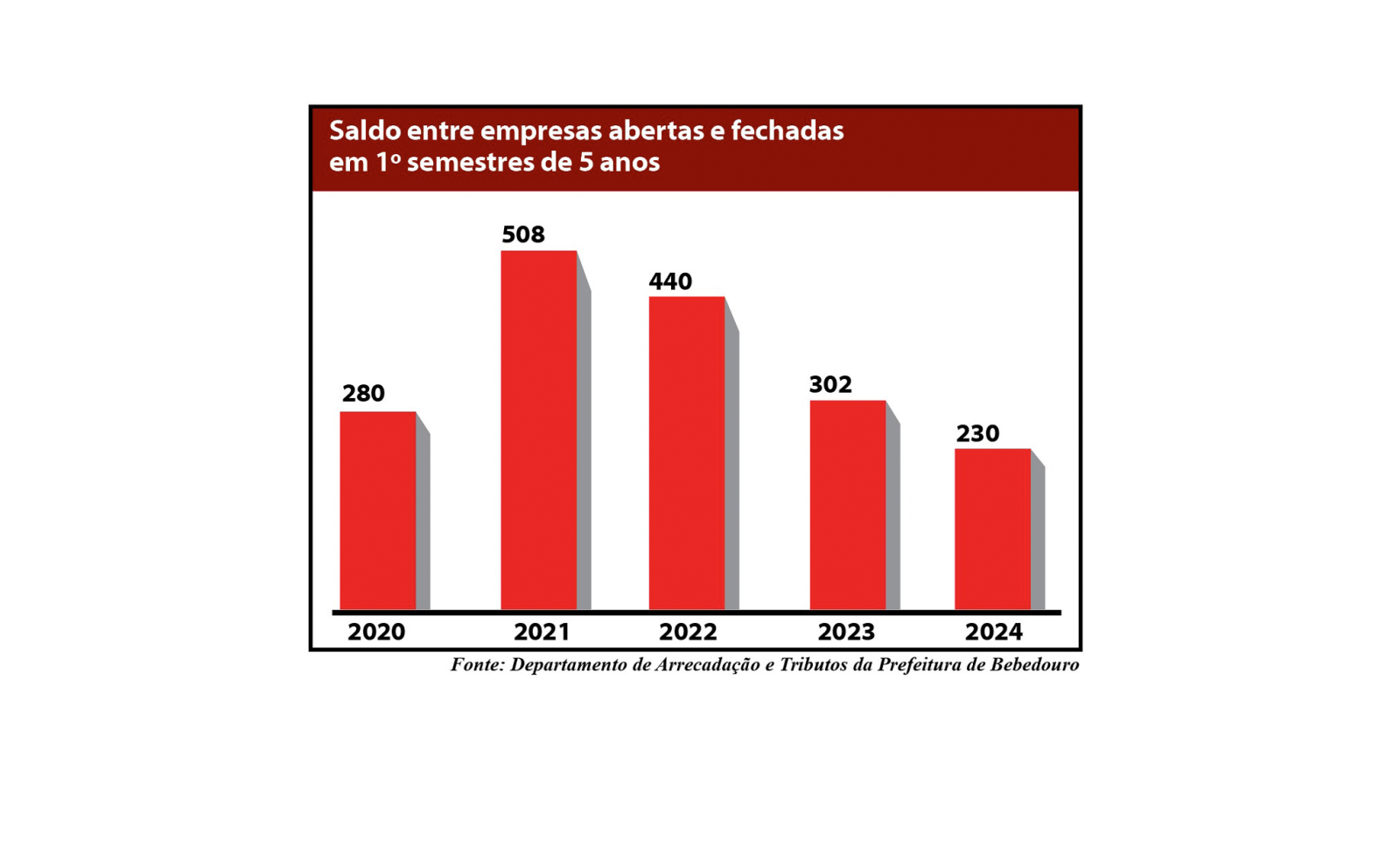 O número de empresas que abriram as portas em Bebedouro, no primeiro semestre de 2024 foi menor que o registrado em 2023: (362 x 539), queda de 32,83%, segundo dados do Departamento de Arrecadação e Tributos da Prefeitura Municipal, solicitados pela Gazeta.