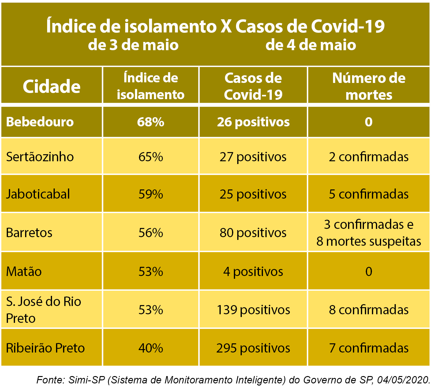 Na sexta, feriado de 1º de maio, o índice saltou para 67%. No sábado (2), mesmo com funcionamento do comércio durante a manhã, Bebedouro registrou 60% de isolamento. Já no domingo (3), levantamento mais recente apontado pelo Simi-SP, o índice da cidade voltou a subir para 68%.