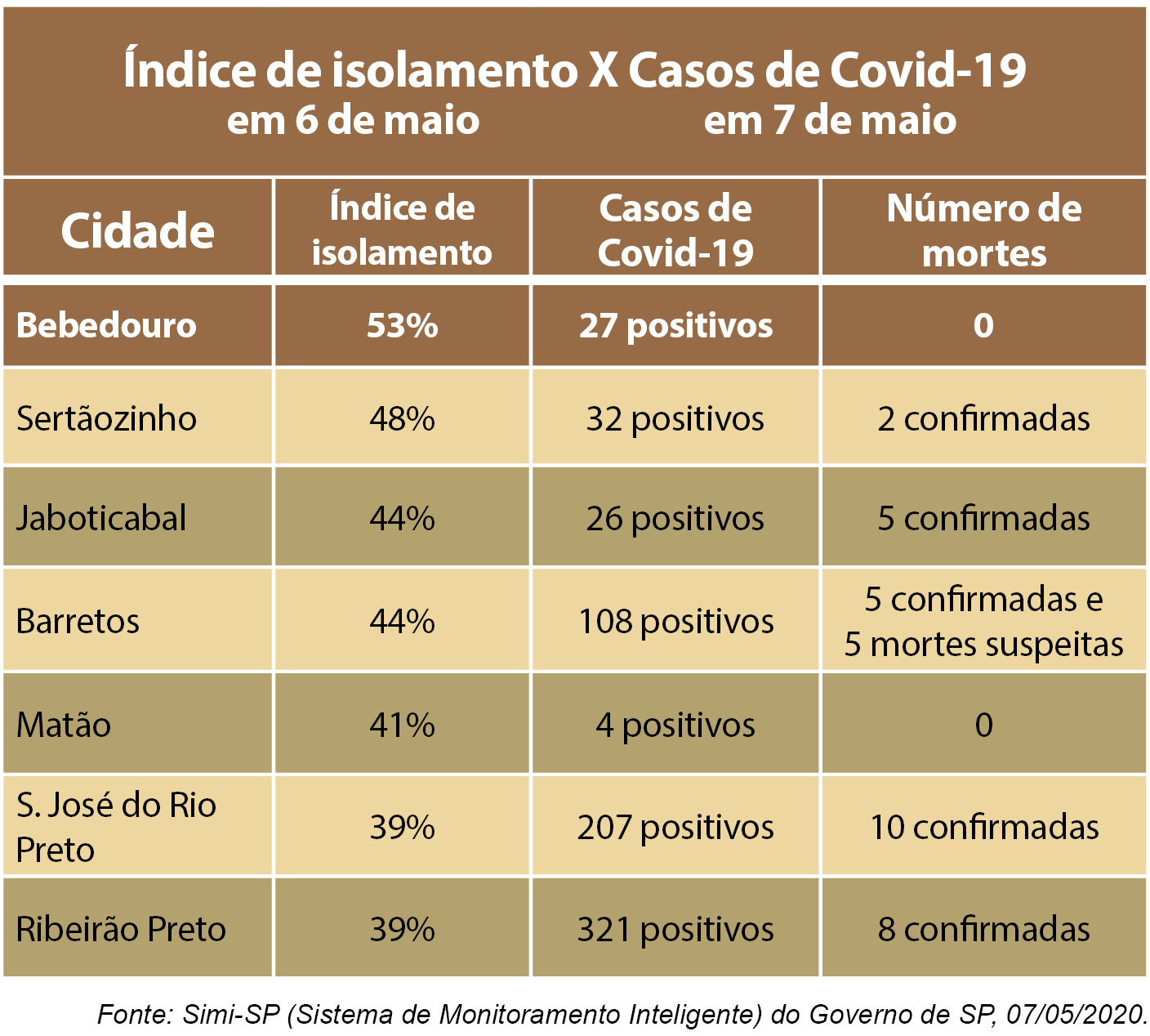 Na segunda (4), último levantamento apontado pela Gazeta, Bebedouro apresentava índice de 55%. Na terça o isolamento na cidade caiu levemente para 53% e manteve o índice na quarta (7), em 14º lugar no ranking paulista.
