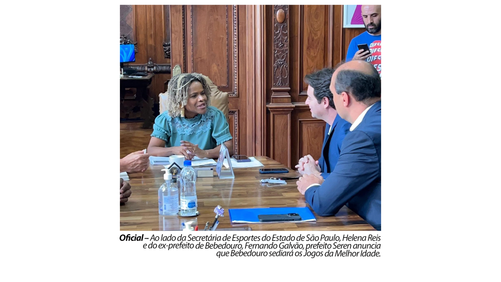 Bebedouro será sede regional da 26ª edição do Jomi (Jogos da Melhor Idade). A reunião que confirmou o anúncio foi entre o prefeito Lucas Seren, na quarta-feira (7), com a Secretária de Esportes do Estado de São Paulo, Helena Reis, o ex-prefeito de Bebedouro Fernando Galvão e o secretário municipal de Esportes, Joel Monteiro.