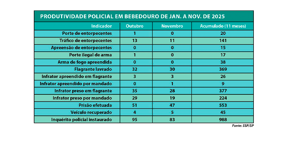 Dados da produtividade policial divulgados pela SSP/SP (Secretaria de Segurança Pública do Estado de São Paulo), referentes ao período de janeiro a novembro, mostram como se comportaram os principais indicadores de atuação policial em Bebedouro.