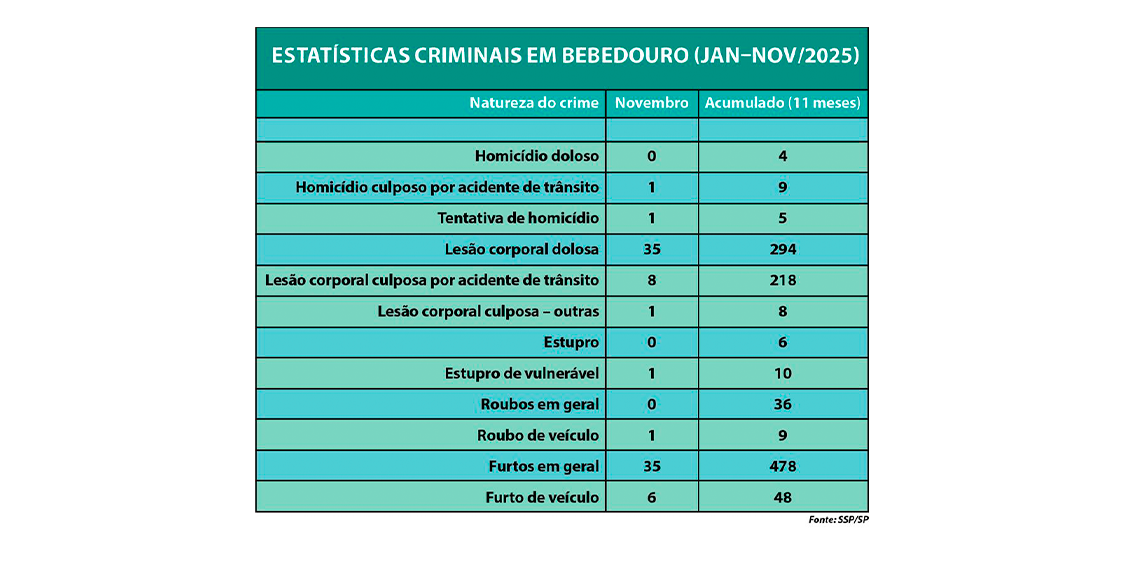 Dados divulgados no final de dezembro de 2025 pela SSP/SP (Secretaria de Segurança Pública do Estado de São Paulo) apresentam balanço das estatísticas criminais registradas em Bebedouro em novembro de 2025, além do acumulado dos 11 meses.