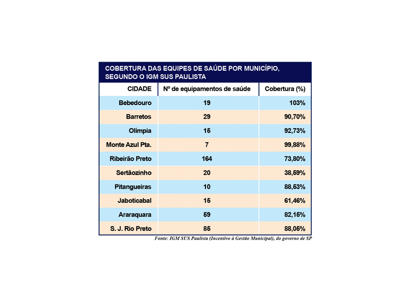 Através do painel do IGM SUS Paulista (Incentivo à Gestão Municipal), a Gazeta analisa os dados da cobertura das UBS’s em Bebedouro e cidades da região. O Estado considerou, quando investiu verba nas cidades para o enfrentamento à dengue, que Bebedouro tem 77.612 habitantes e contabiliza a existência de 19 equipamentos de saúde com cobertura de 79.938 pessoas. Com isto, a saúde de Bebedouro estaria coberta em 103%. Os dados do painel consideram o ano de 2025 e foi acessado pela Gazeta na quinta-feira (30 de janeiro).