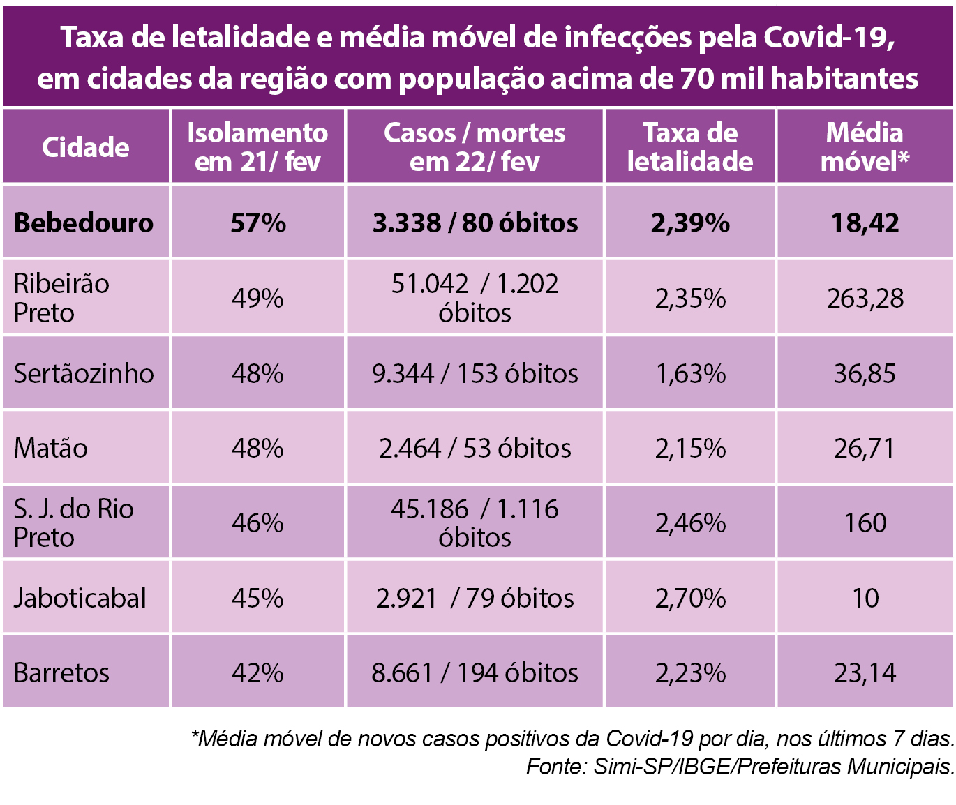 Bebedouro tem 3.338 pessoas infectadas pela Covid-19 desde março de 2020, segundo boletim desta segunda-feira (22). Deste montante, 2.948 residem em Bebedouro e 390 moram em cidades da microrregião, mas foram diagnosticadas em hospitais locais. A média móvel é de 18,42 novas infecções por dia, considerando os últimos sete dias.