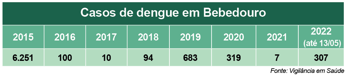 Nos primeiros quatro meses e meio deste ano, o número de casos de dengue em Bebedouro já supera o de anos inteiros desde 2016, exceto 2019 e 2020. Dados da Vigilância em Saúde apontam que, até o último dia 13 de maio, o município havia registrado 307 casos da doença. No ano passado todo, foram 7. Em 2016, houve 100; em 2017, 10; e em 2018, 94. Após a explosão de casos em 2015, quando Bebedouro teve 6.251 casos, eles voltaram a subir um pouco em 2019, com 683, e 2020, com 319.