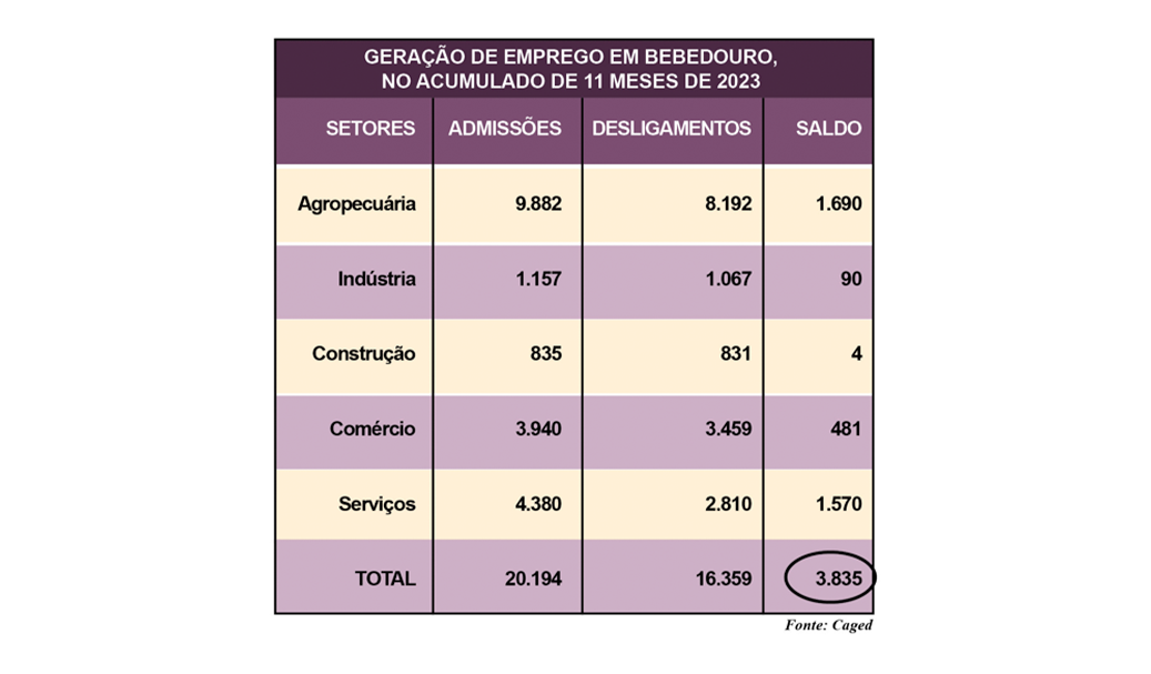 Em novembro, o Caged (Cadastro Geral de Empregados e Desempregados), do Ministério da Economia, apontou que Bebedouro fechou com saldo negativo na geração de empregos com carteira assinada: (-) 76 vagas, resultado de 1.063 admissões e 1.139 desligamentos.