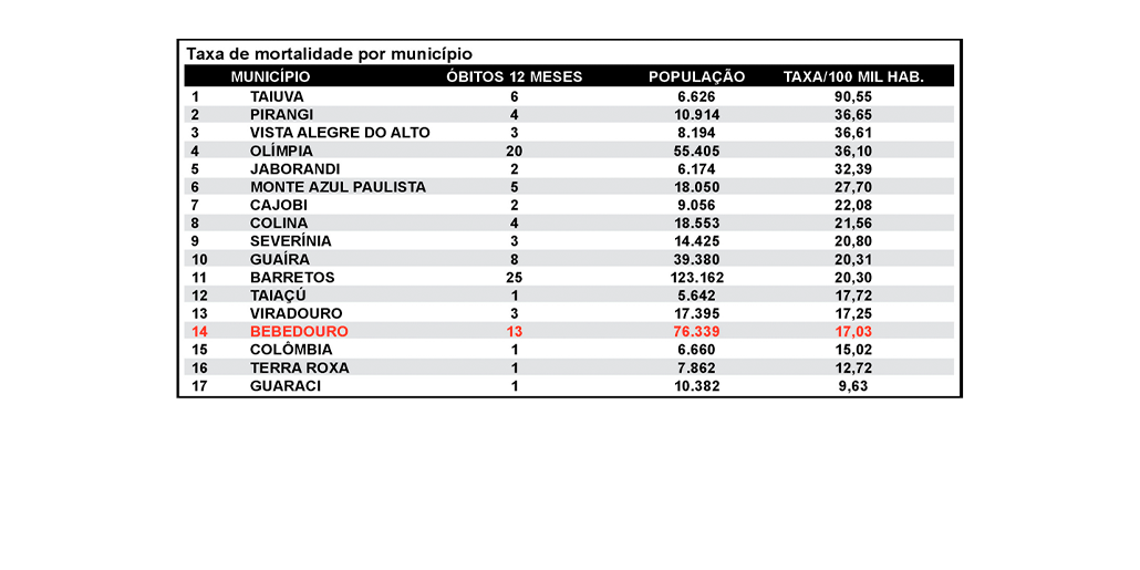 De acordo com dados do Infosiga (Sistema de Informações de Acidentes de Trânsito do Estado de São Paulo), Bebedouro registrou 13 mortes no trânsito nos últimos 12 meses, o que representa taxa de 17,03 óbitos por 100 mil habitantes. O índice coloca o município na 14ª posição entre 17 cidades da regional de Barretos, evidenciada como das menores taxas da região, apesar do número absoluto ser maior que o de municípios menores.