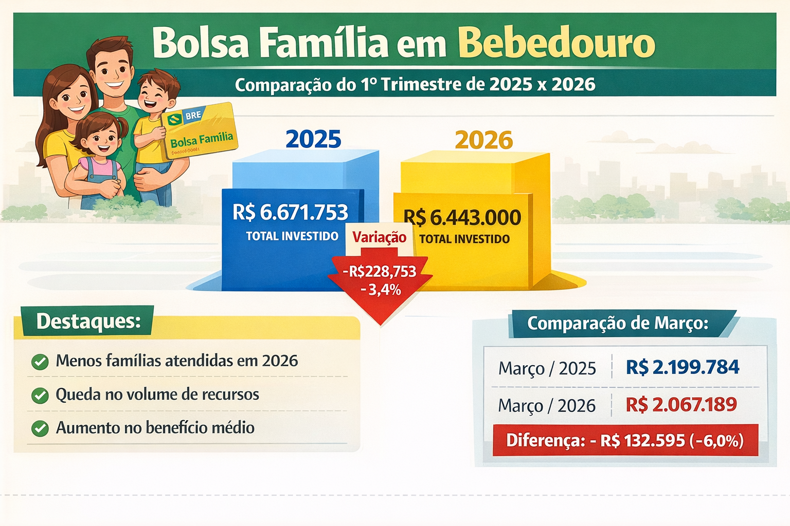 O Programa Bolsa Família manteve forte impacto econômico em Bebedouro em março, com investimento de R$ 2.067.189 destinados a 3.011 famílias num total de 8.253 pessoas atendidas. Com isso, o acumulado do primeiro trimestre do ano já chega a R$ 6,443 milhões, consolidando a importância do programa na sustentação da renda de milhares de moradores.