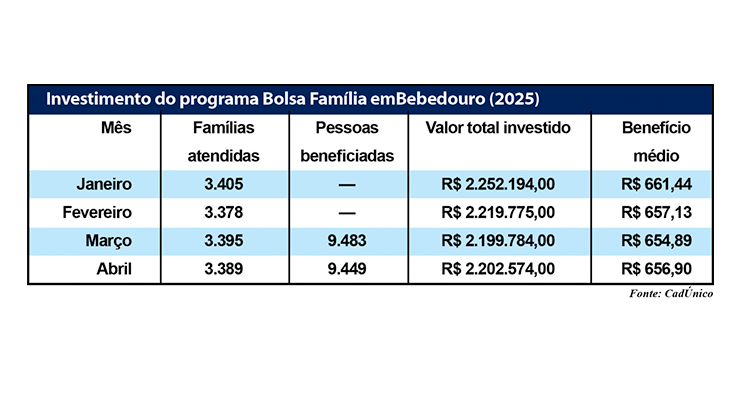 Bebedouro recebeu, em abril, investimento total de R$ 2.202.574 do Governo Federal por meio do Programa Bolsa Família. O valor beneficiou diretamente 3.389 famílias, alcançando 9.449 pessoas. O benefício médio repassado às famílias bebedourenses foi de R$ 656,90.