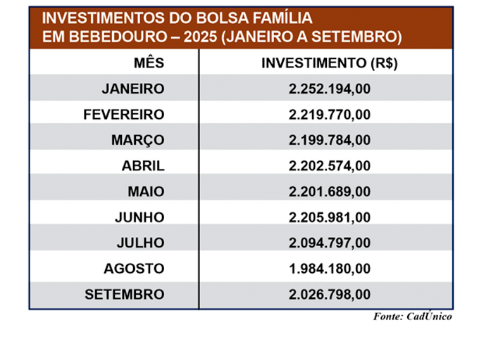 Bebedouro manteve em setembro a marca de quase três mil famílias atendidas pelo Programa Bolsa Família. Segundo dados do portal do CadÚnico, do Governo Federal, foram 2.994 famílias contempladas, beneficiando 8.182 pessoas. Apesar de leve queda em comparação a agosto, quando o programa alcançou 3.003 famílias e 8.225 pessoas, o repasse federal ao município cresceu.