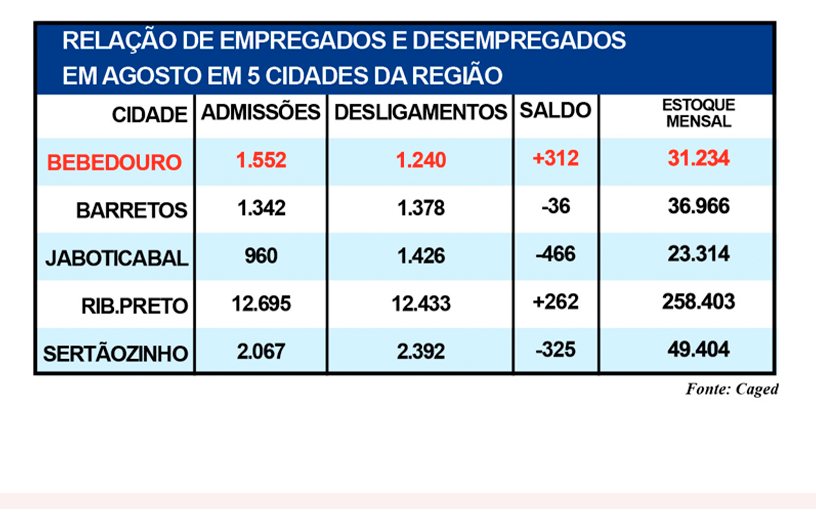Levantamento do Caged (Cadastro Geral de Empregados e Desempregados) mostra cenários bastante distintos no mercado de trabalho das cidades da região analisadas pela Gazeta: Bebedouro, Barretos, Jaboticabal, Ribeirão Preto e Sertãozinho. Apenas dois registraram saldo positivo: Bebedouro e Ribeirão Preto. Enquanto a maior cidade da região fechou o mês com (+) 262 vagas e variação de (+) 0,10%, Bebedouro apresentou desempenho acima da média, com (+) 312 empregos e crescimento de (+) 1,01% no estoque de empregos formais.