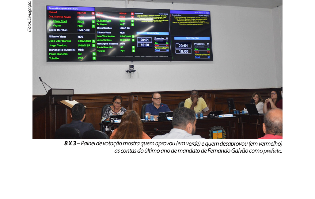 Os vereadores aprovaram na noite de segunda-feira (25), as contas do prefeito Fernando Galvão (DEM), referente ao exercício de 2020, por 8 votos a 3. Votaram a favor, Jorge Cardoso e Eliane Merchan, do UB, Edgar Cheli (PSDB), Vagner Castro (PSB), Gilberto Viana (MDB), João Victor Martins (CDD), Paulo Bianchini (SD) e Marcelo dos Santos (PDT). Pela rejeição votaram Ivanete Xavier (PSDB), Mariângela Mussolini (PMDB) e Chanel (Republicanos).
