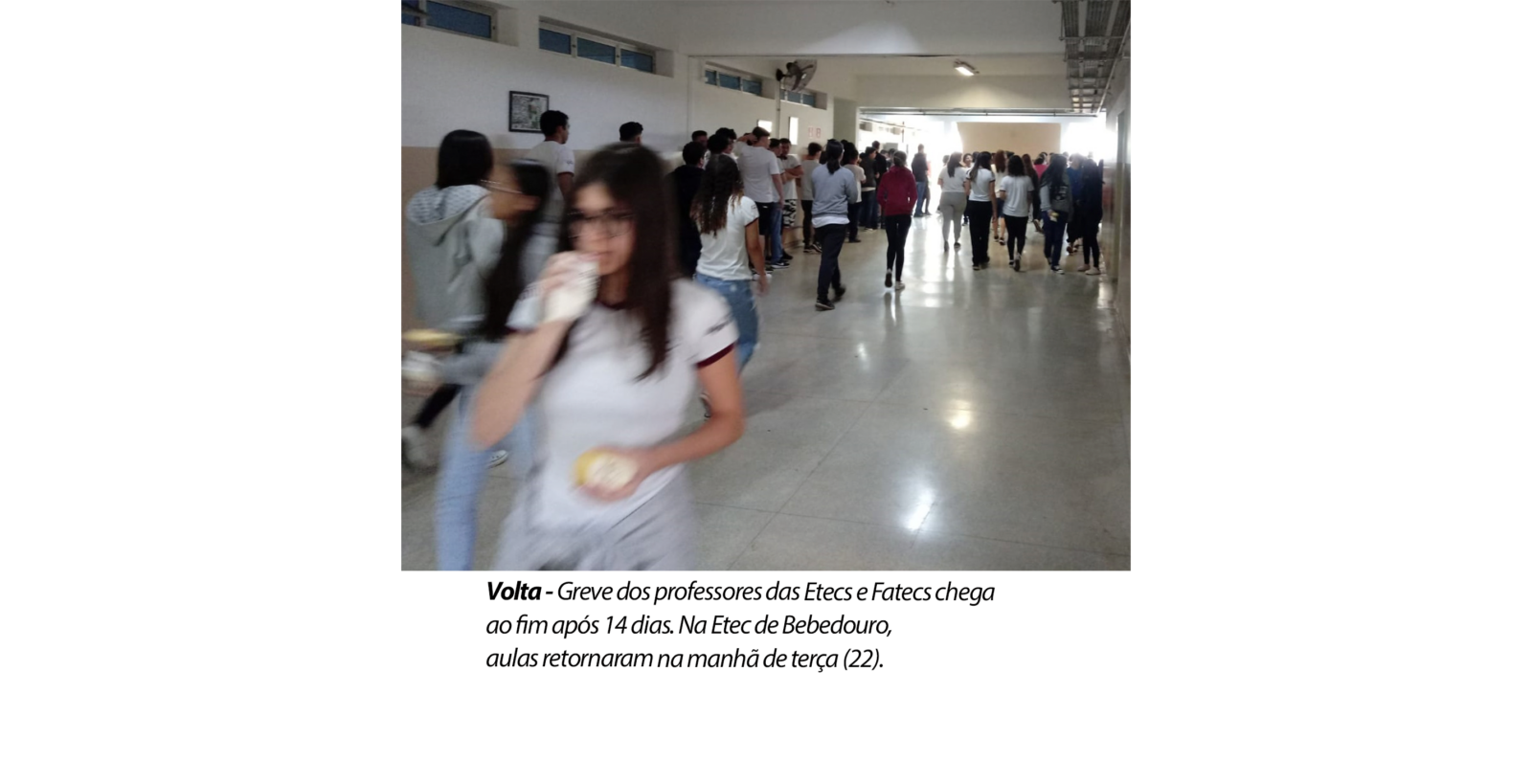 Teve fim, na segunda-feira (21), após 14 dias, a greve de Etecs e Fatecs em todo o Estado de São Paulo que acontecia desde 8 de agosto, envolvendo professores, auxiliares docentes e funcionários administrativos. Na última atualização da Gazeta, na edição 10.781 de 16 de agosto, em nota, o Centro Paula Souza havia informado que a adesão à paralisação havia atingido 13% dos professores, de acordo com dados referentes aos três turnos de aulas. Em Bebedouro, a Fatec não aderiu à greve.