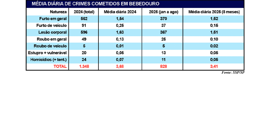 Bebedouro registrou 828 ocorrências criminais entre janeiro e agosto de 2025, o que representa média de 3,4 crimes por dia no município. Os números, divulgados pela SSP/SP (Secretaria de Segurança Pública do Estado de São Paulo), revelam que, embora os homicídios sejam pouco frequentes, a rotina policial é marcada por furtos e lesões corporais, que concentram quase 90% das notificações.