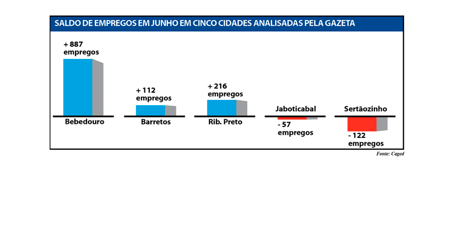 A Gazeta analisou os dados do Caged referentes ao mês de junho e traz o panorama do mercado de trabalho em cinco cidades da região: Bebedouro, Barretos, Ribeirão Preto, Jaboticabal e Sertãozinho. Entre elas, o maior destaque foi Bebedouro, que encerrou o mês com saldo de 887 novos empregos formais, superando as demais cidades acompanhadas pela Gazeta. Enquanto Barretos (+112) e Ribeirão Preto (+216) também registraram saldo positivo, Jaboticabal (-57) e Sertãozinho (-122) fecharam junho no vermelho. Confira.