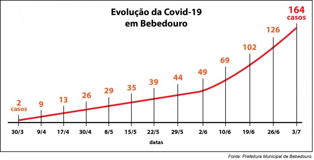 Em Bebedouro, considerando-se os 164 casos positivos e população de 77,5 mil, apontada pela estimativa do IBGE, a taxa de contaminação é de 2,11 infectados por cada mil bebedourenses. Nas demais cidades as taxas são: Barretos (10,04/mil), Ribeirão Preto (7,95/mil), Rio Preto (6,68/mil), Sertãozinho (4,73/mil), Jaboticabal (1,54/mil) e Matão (1,48/mil).