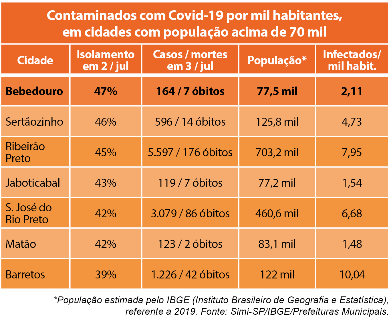 Em Bebedouro, considerando-se os 164 casos positivos e população de 77,5 mil, apontada pela estimativa do IBGE, a taxa de contaminação é de 2,11 infectados por cada mil bebedourenses. Nas demais cidades as taxas são: Barretos (10,04/mil), Ribeirão Preto (7,95/mil), Rio Preto (6,68/mil), Sertãozinho (4,73/mil), Jaboticabal (1,54/mil) e Matão (1,48/mil).