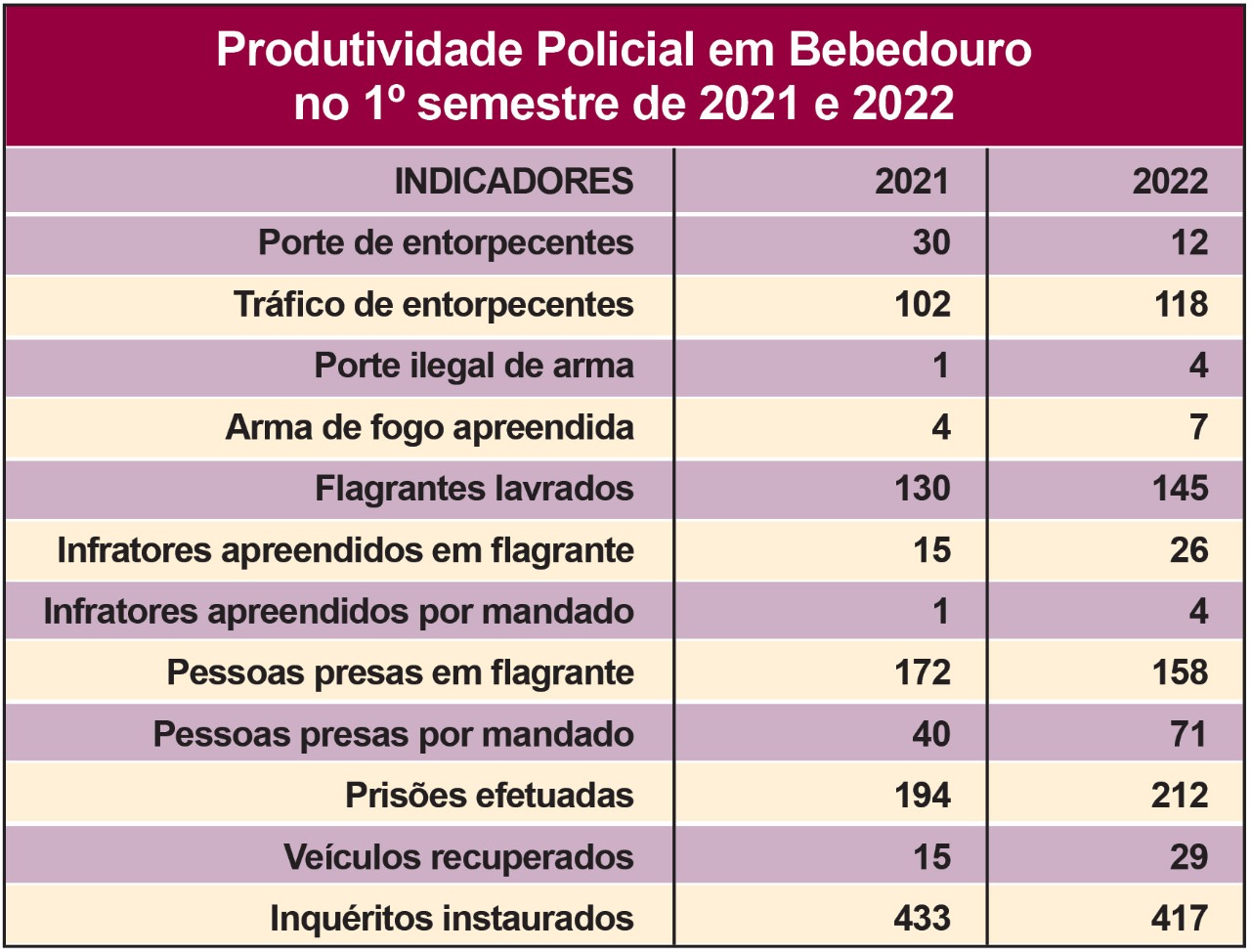 No primeiro semestre de 2022, comparando com o mesmo período de 2021, a produtividade policial em Bebedouro cresceu em nove dos 12 indicadores existentes, segundo dados da SSP/SP (Secretaria de Segurança Pública do Estado de São Paulo). O maior crescimento (+93,33%) foi no número de veículos recuperados. Foram 29 entre janeiro e junho deste ano e 15 nos seis primeiros meses de 2021.
